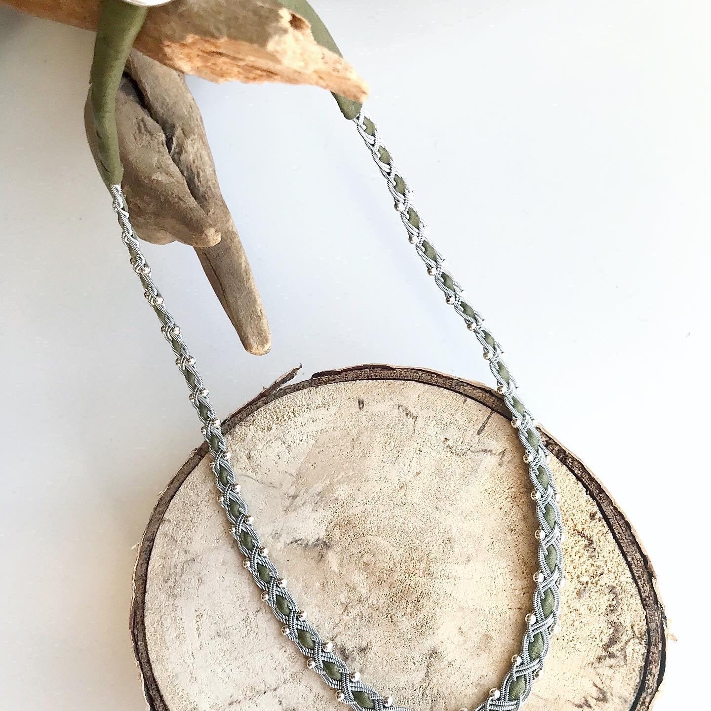 Scandinavian light olive Sami reindeer leather necklace with a full set of sterling silver beads.